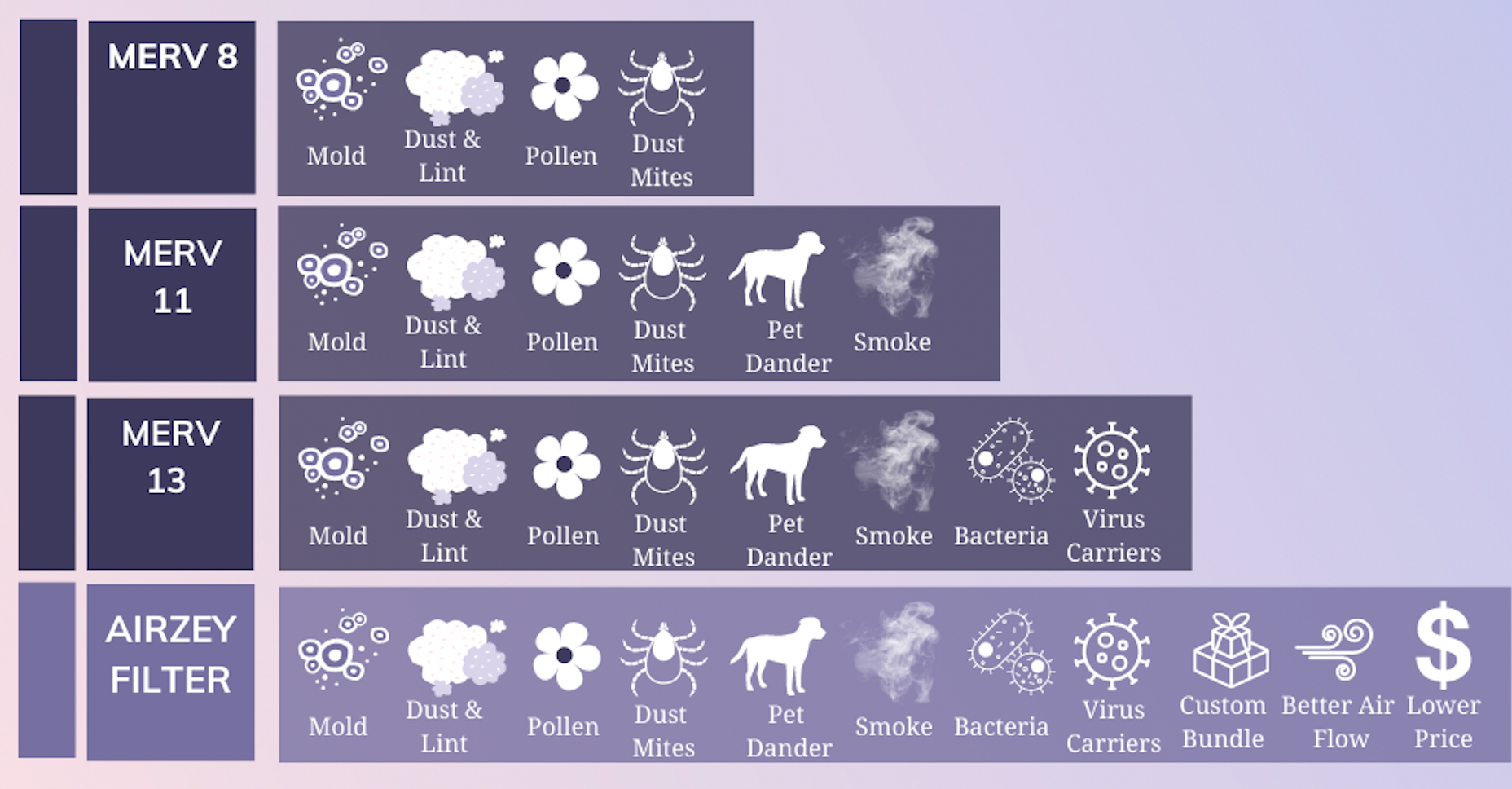 - MERV 13 (captures very small particles like bacteria in addition to the larger dust, pollen, and smoke particles)
